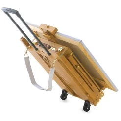 When open, this laminated bamboo easel extends up to 70″ high, and holds canvases up to 32″ high. Fully folded, it measures only 16″W × 24″H × 6¾”D. Wheels and a pop…