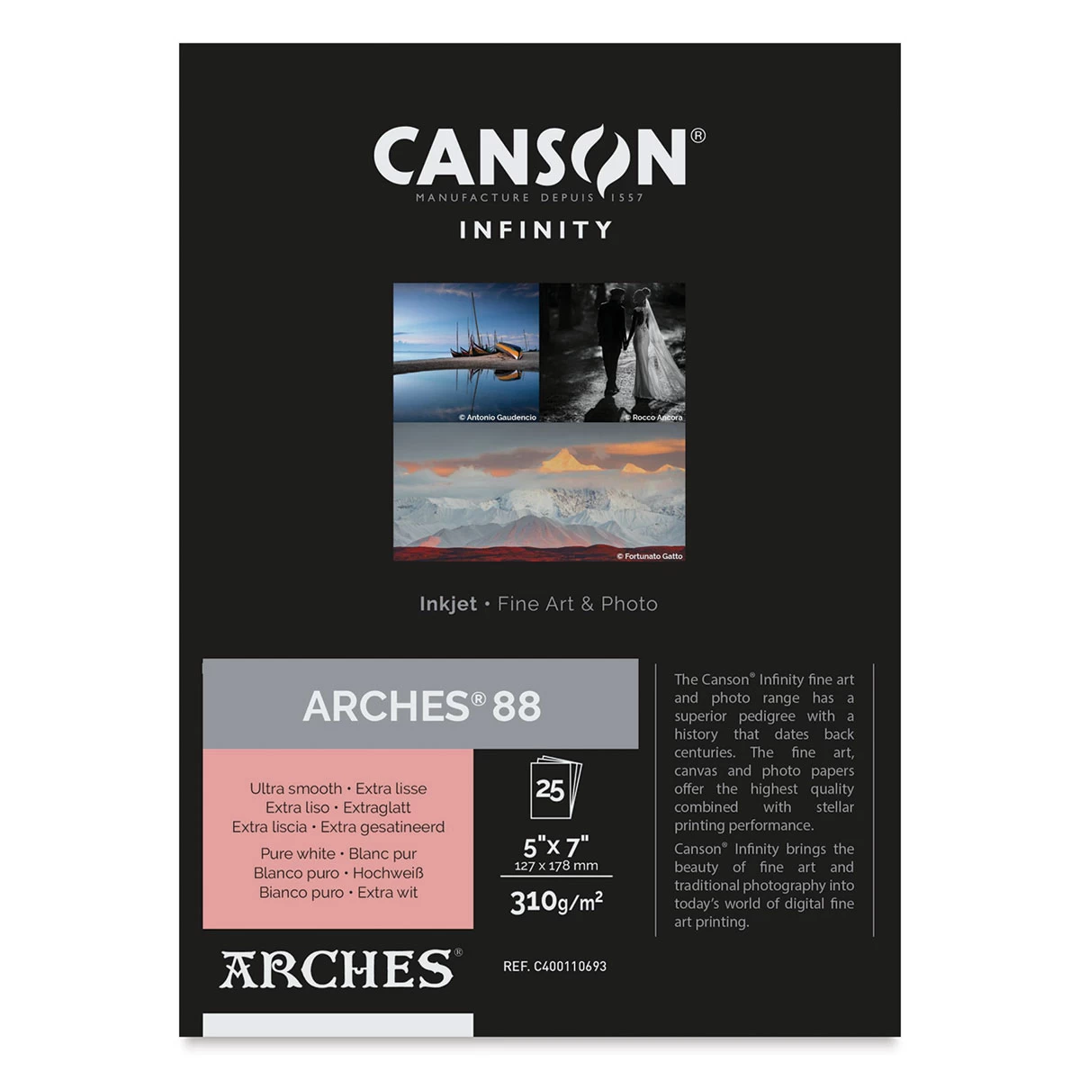 Canson Infinity Arches 88 Inkjet Fine Art and Photo Paper is one of the smoothest mouldmade papers on the market for use with inkjet printers. The absolutely pure white color has no artificial brighteners and produces prints with outstanding, true color rendition, including deep blacks, natural whit…