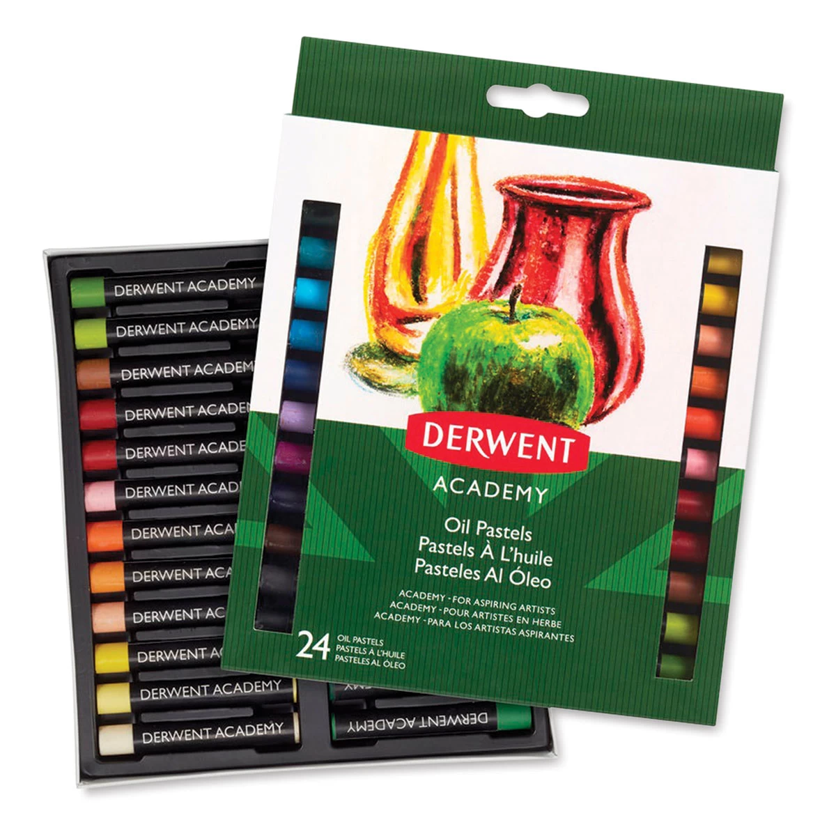Vibrant, pigmented colors and a unique texture make Derwent Academy Oil Pastels ideal for drawing or coloring. Both aspiring artists and hobbyists will enjoy their dust-free formula and creamy texture that quickly transfers to the paper and blends well with other colors.
