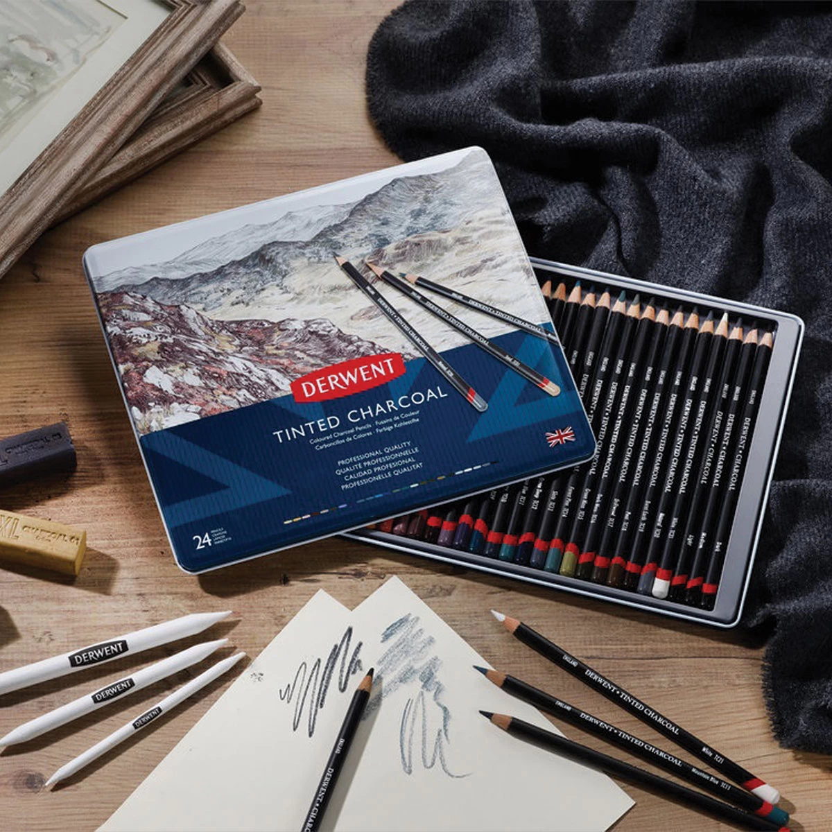 Derwent Tinted Charcoal Pencils offer a new twist on one of the earliest drawing mediums. Natural charcoal particles are mixed with a small amount of pigment and the finest clays to extend creative possibilities.