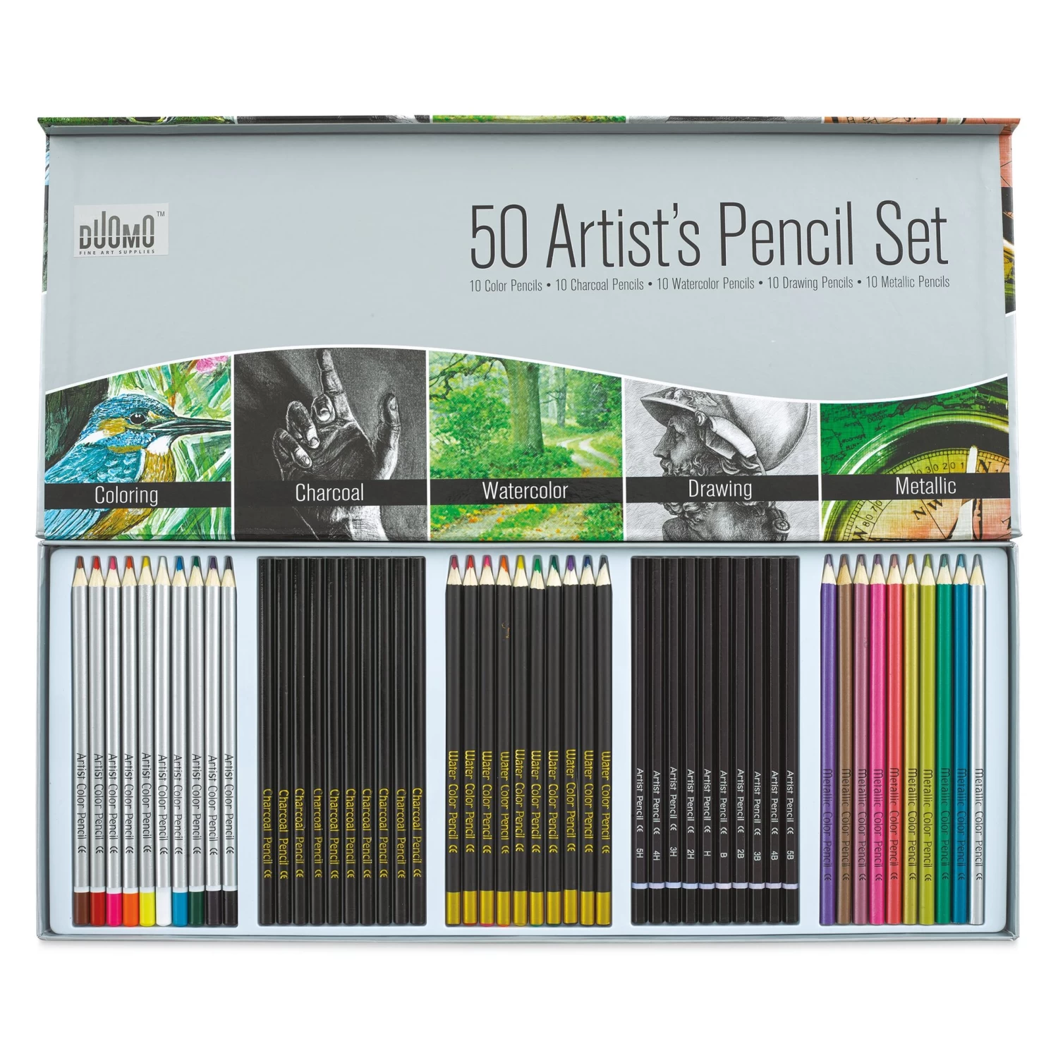 Whether you’re a student looking to experiment with different drawing styles, or an accomplished artist rounding out their supplies, the Duomo Artist’s Mixed Media Pencils Set has something for everyone. This set comes in a lift-lid box and provides you with colored pencils, charcoals, metallics, an…