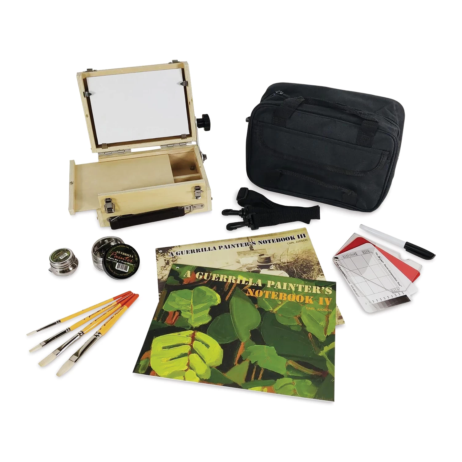 The Guerrilla Painter Pocket Box Travel Kit contains nearly everything you need to get out and start painting plein air style — just add paint!