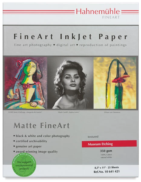 Hahnemühle Museum Etching Inkjet Paper is a 100% cotton, natural white paper with a distinctive textured surface.
