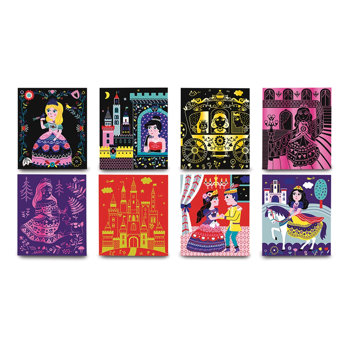 With the Janod Princesses Scratch Art Kit your child can make beautiful princesses-themed scratch art great for room decorations and more. Simply scratch the pre-drawn pictures to see the princesses appear.