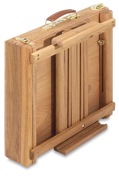 This elegant table easel turns into a travel case for painting on the go.The oiled elmwood box holds a canvas up to 34″ high. It has a tin-lined, locking pullout drawer for supplies. Organize supplies the way you like — drawer compartments are adjustable.