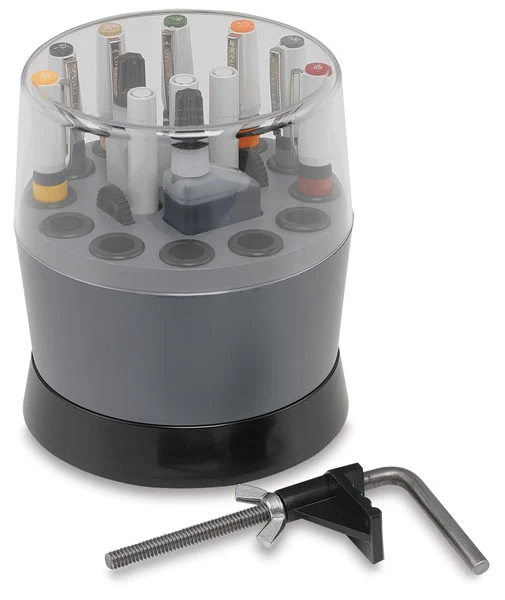 The Rapidograph Humidified Revolving Selector prevents ink from drying in pen points. Each set includes 3 pen holders, a bottle of ink, a bottle of pen cleaner, a board clamp, nib keys and a cap for each point.