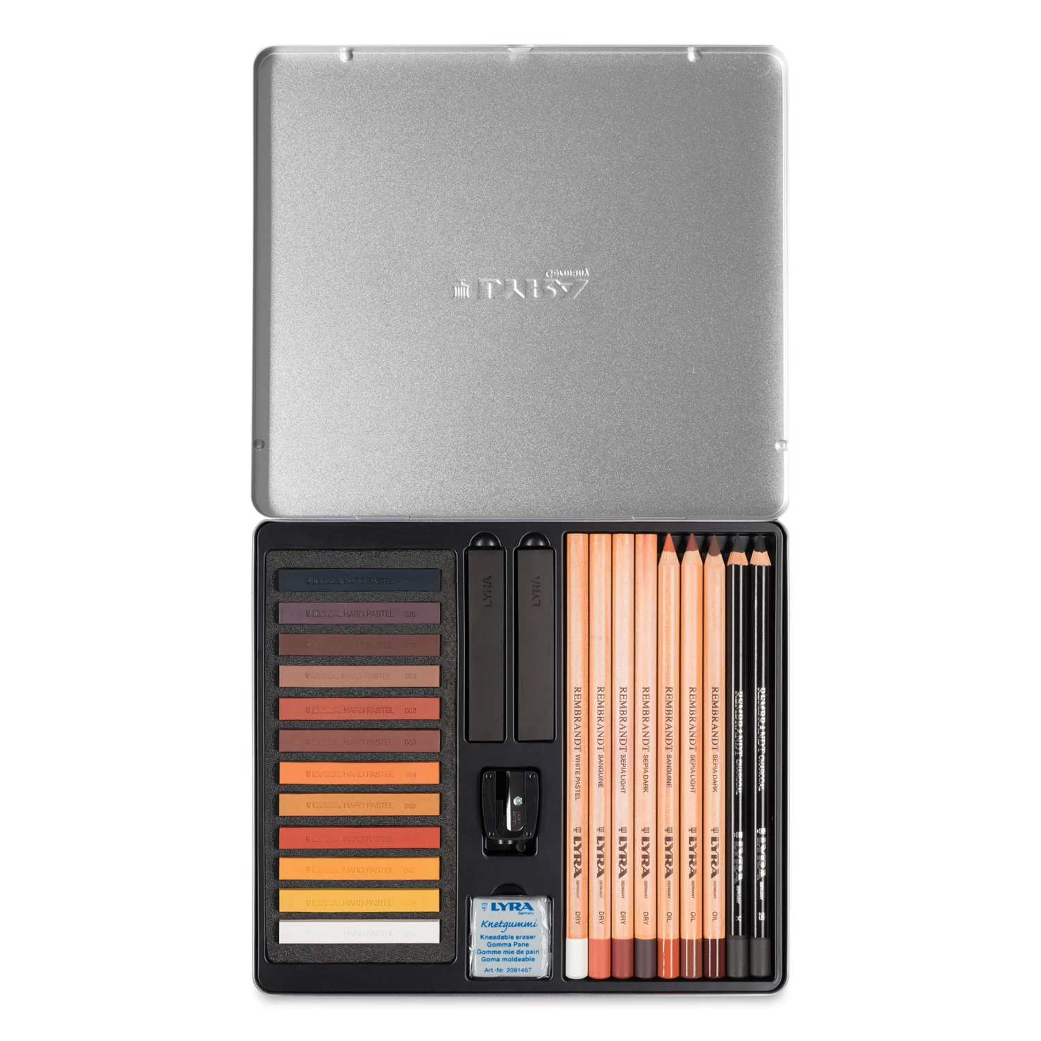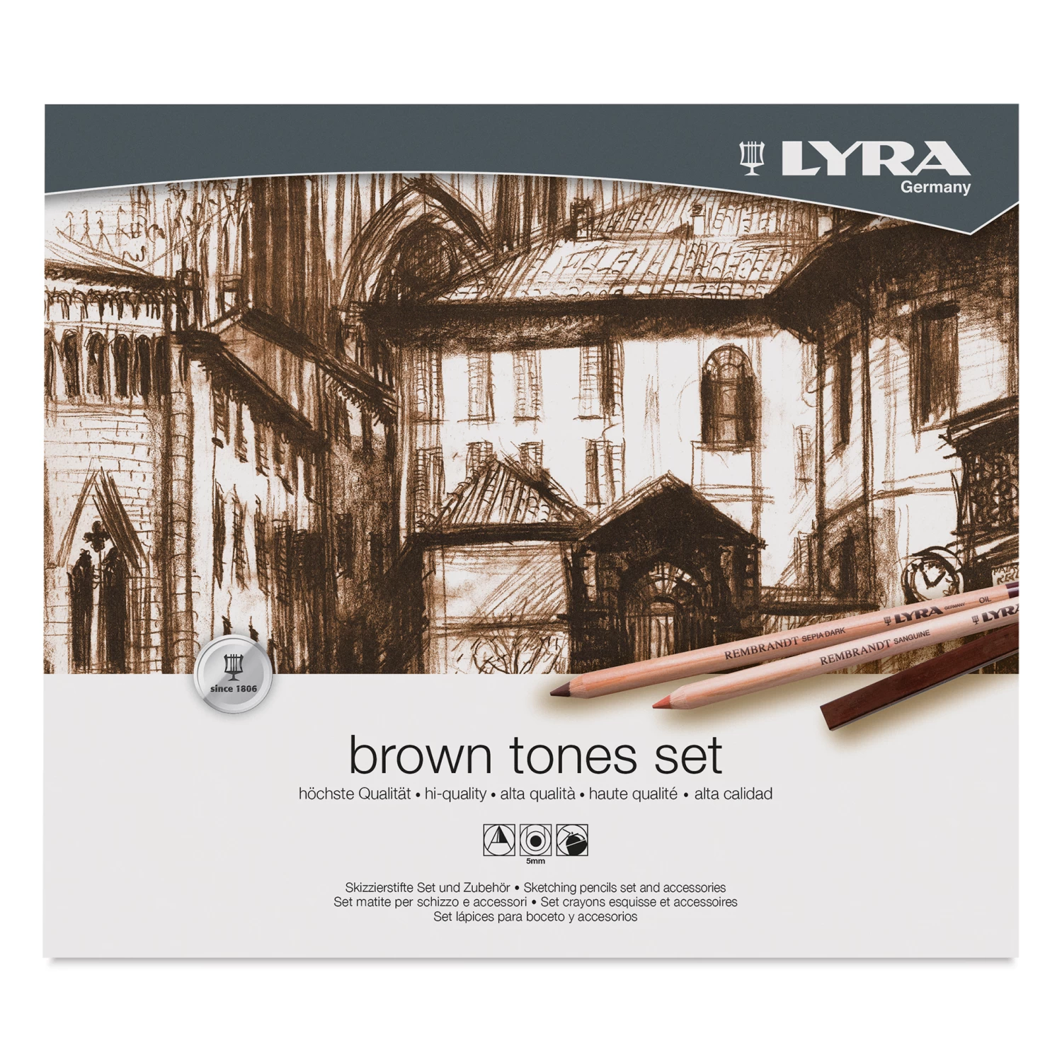 Infuse your work with style and nostalgia with the Lyra Brown Tones Sketching Set. Made in Germany, these pencils are made from 100% PEFC-certified cedar wood and contain extra-thick, durable 5 mm lead. This 25-piece set includes Sanguine, Sepia, and White Pastel pencils, as well as a selection of b…