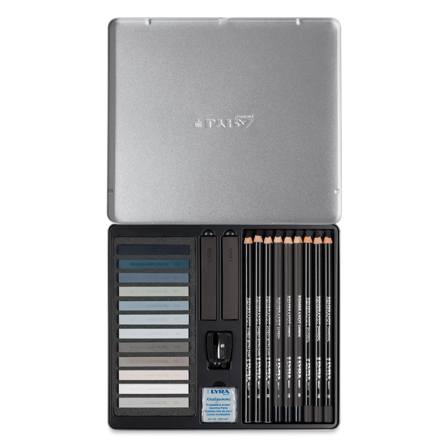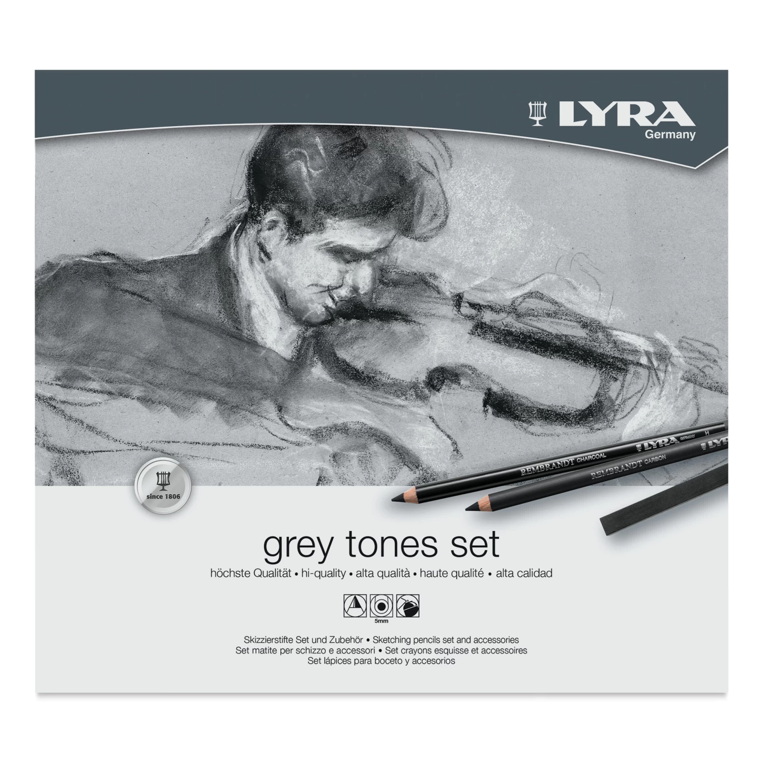 Create striking monochromatic work with the Lyra Grey Tones Sketching Set. Made in Germany, these sturdy pencils are made from 100% PEFC-certified cedar wood and contain extra-thick 5 mm lead. The 25-piece set contains a selection of charcoal, graphite, and carbon pencils, along with various grey-to…