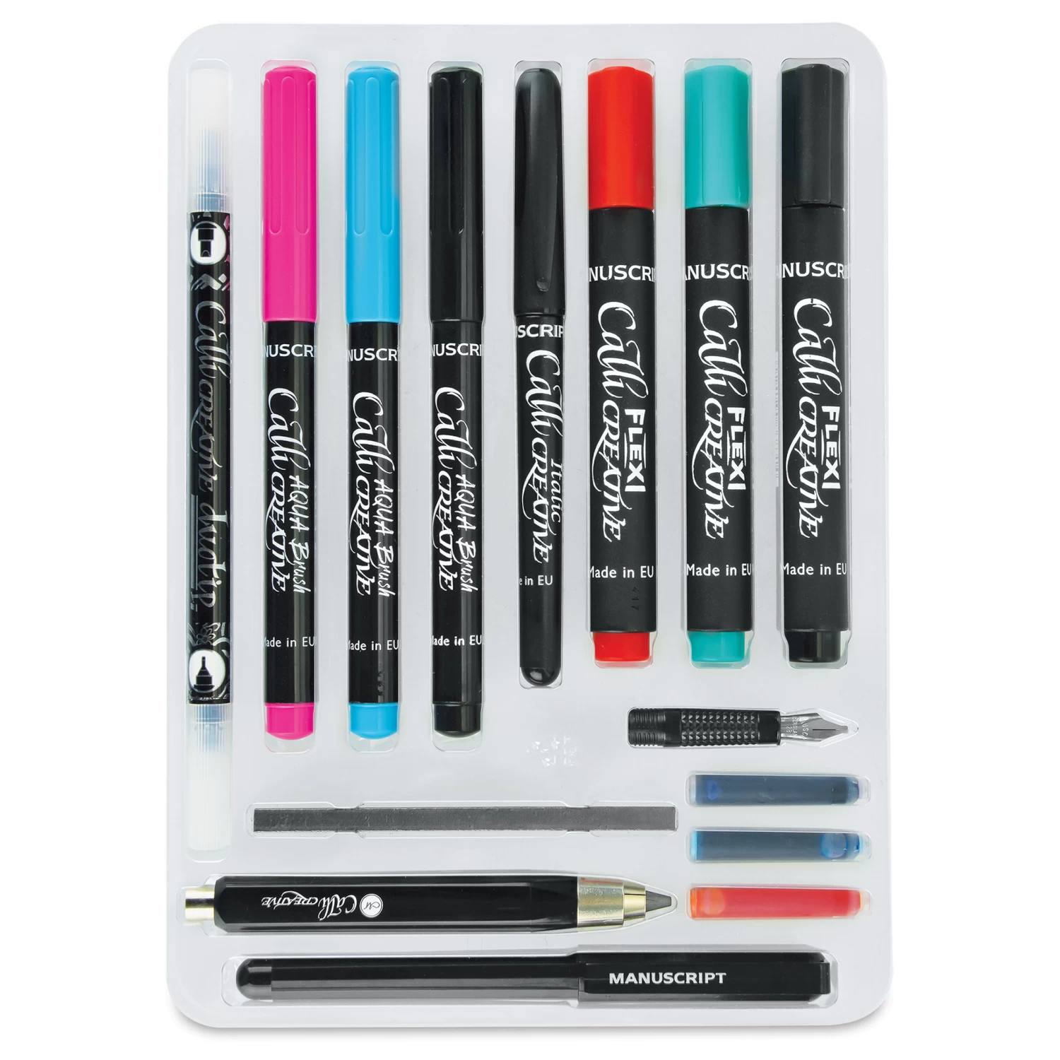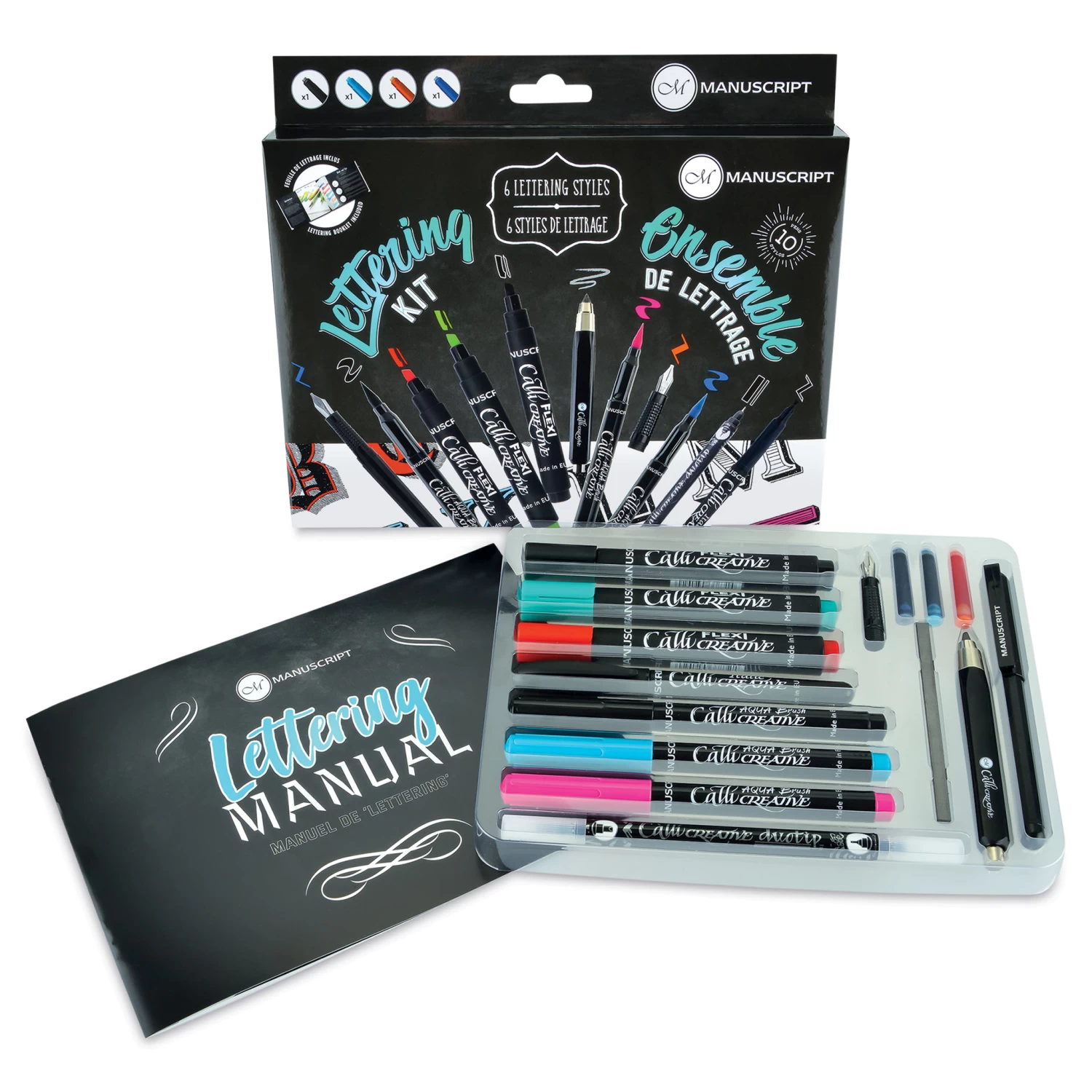From big, bold fonts to delicate calligraphy, master hand lettering essentials with the Manuscript Lettering Kit. Perfect for beginners, this comprehensive kit comes with everything you need to get started. It includes a selection of 10 vibrant markers, a fountain pen, ink, clutch pencil, and an eas…