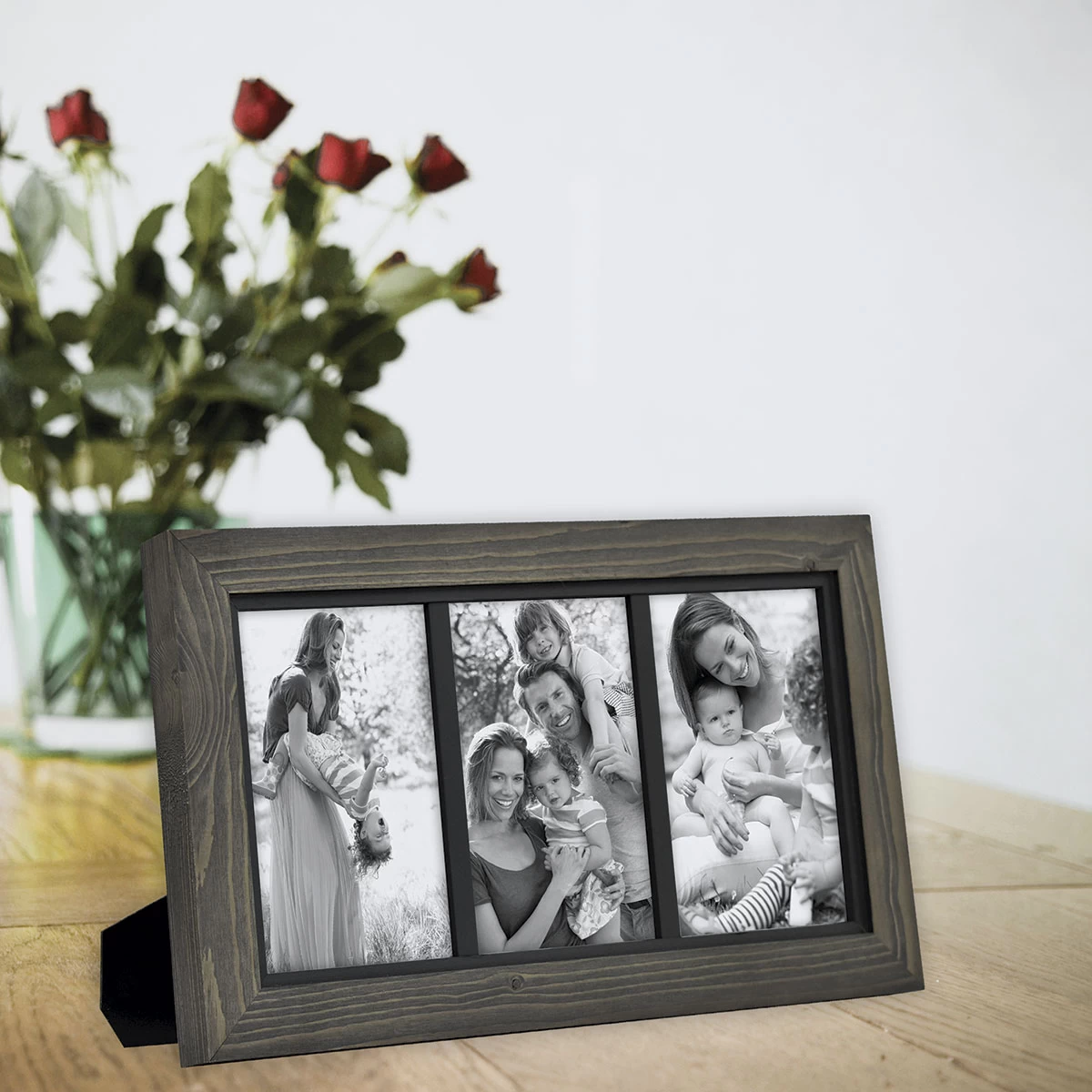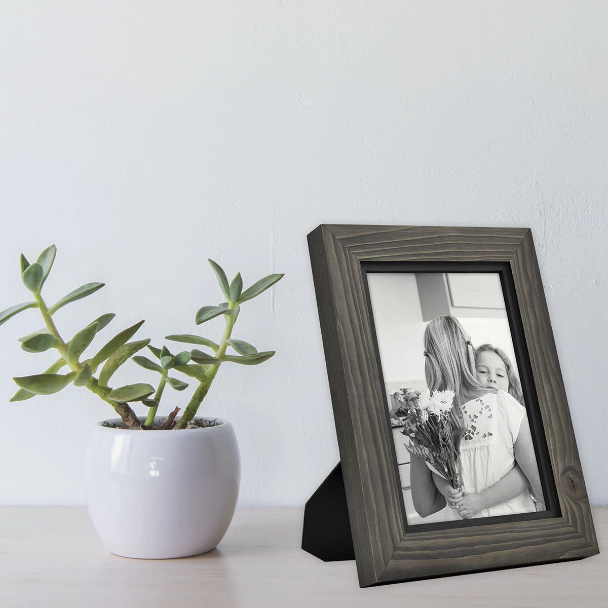 Available in a variety of popular sizes, these stunning solid wood frames feature a high-contrast woodgrain finish set off by a black line that separates your photos or art from the frame.