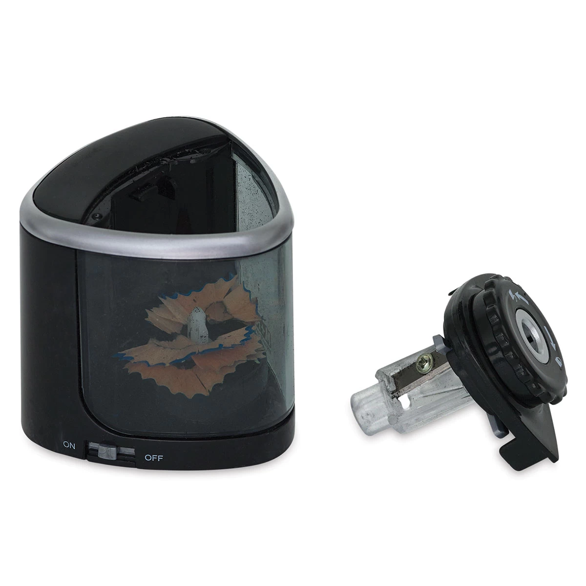 Great for both graphite and colored pencils, the Mobius & Ruppert Battery Operated Pencil Sharpener operates on two AA batteries, and has a see-through plastic shavings receptacle.