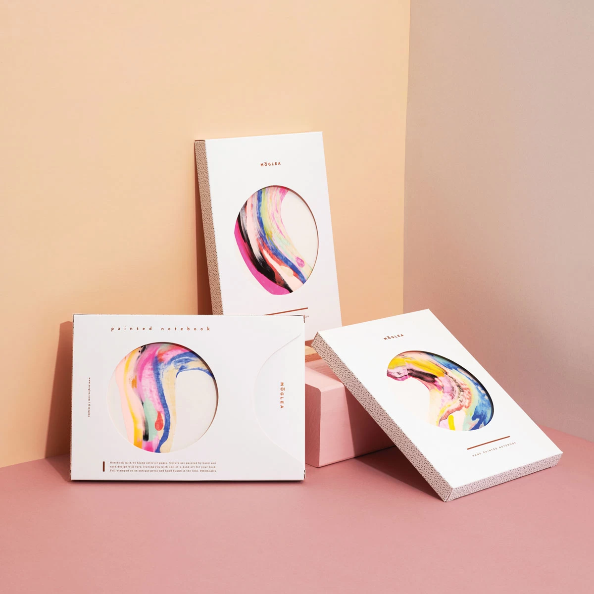 One-of-a-kind Moglea Painted Notebooks bring vibrant color and unique style to your desktop. Perfect for work, class, and personal use, each matboard cover is hand-painted with Blickrylic acrylic paints. Inside are 65 blank pages. They’re made in the USA by Moglea, an Iowa-based design studio that h…