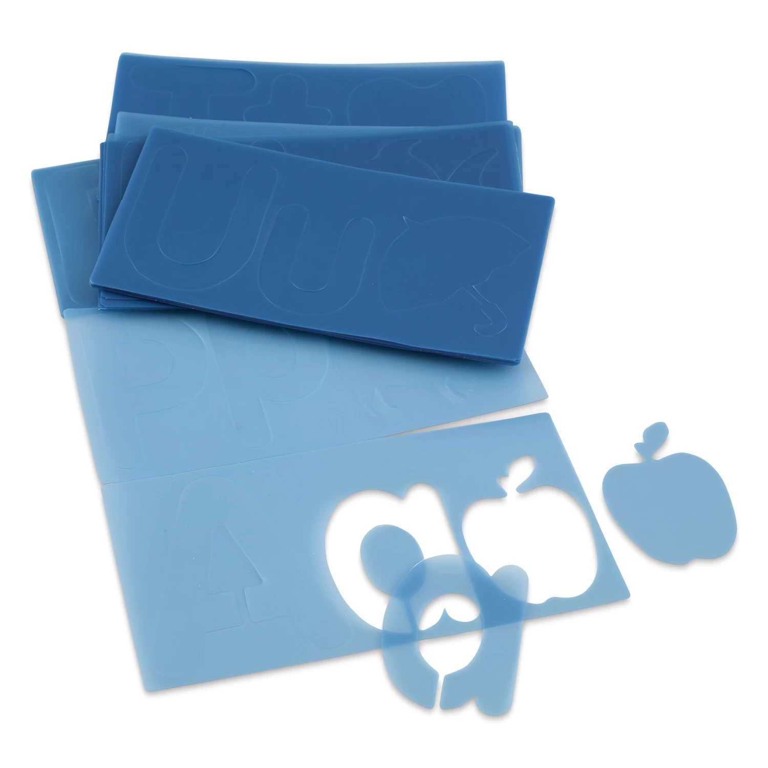 Each of these durable plastic stencil sheets has a 6″ uppercase letter, lowercase letter, and a phonetically appropriate picture.