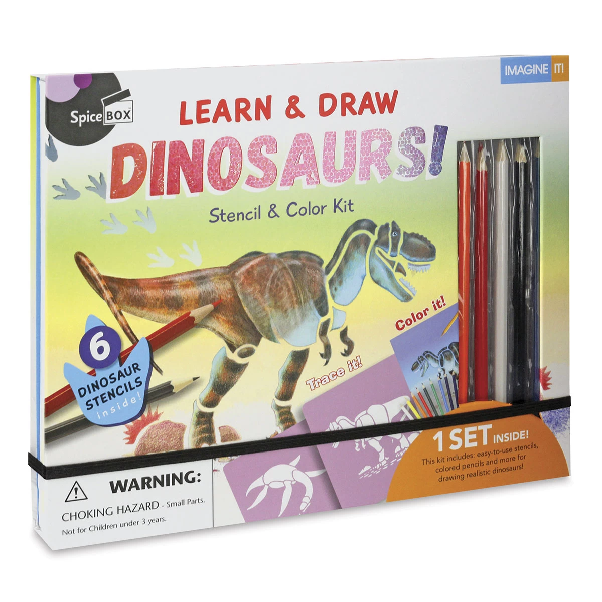 Go back in time and explore the prehistoric world of dinosaurs with Spicebox Imagine It Dinosaurs Stencil and Color Kit! Trace, draw, and color the largest creatures ever to walk the planet while learning incredible dinosaur facts. This fun and educational kit is perfect for ages 6+ and includes eve…