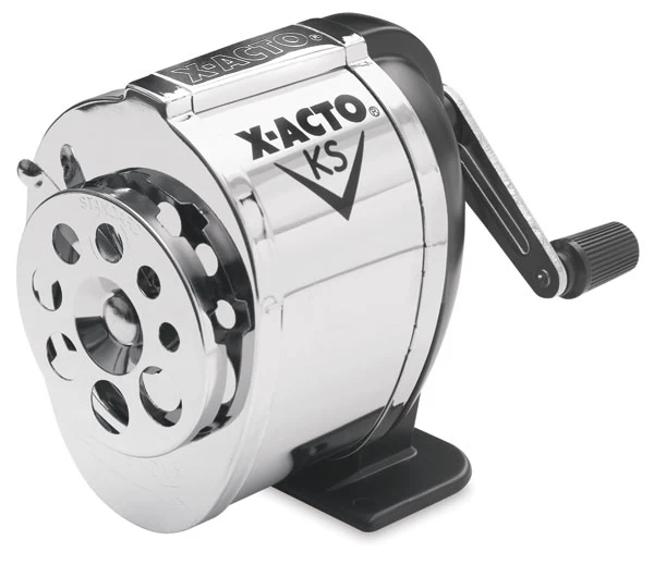 X-Acto’s KS Pencil Sharpener is a versatile, economical sharpener. It has a positive-lock pencil guide which accommodates 8 sizes of pencils. Solid steel gears and 30 cutting edges sharpen the pencils, while an automatic stop prevents oversharpening.